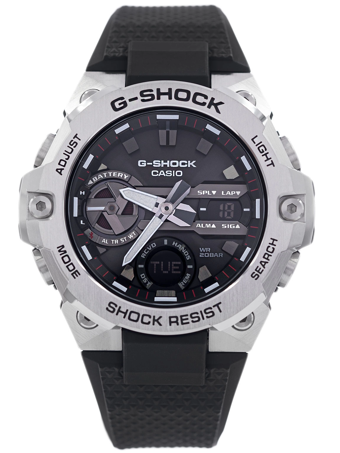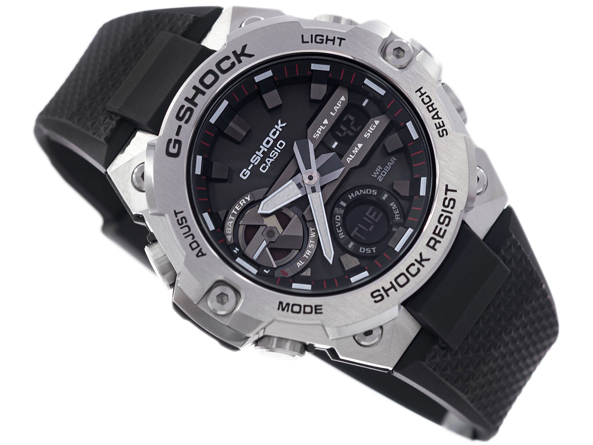 CASIO GST-B400 1AER G-SHOCK G-STEEL wykonany jest z wysokiej jakości tworzywa sztucznego oraz odpornej na korozję stali szlachetnej, koperta posiada elementy karbonowe (Carbon Core Guard). Oprócz mocnej konstrukcji, model ten oferuje wiele przydatnych funkcji. Został wyposażony w Bluetooth, za pomocą którego łączy się ze smartfonem. Umieszczone panele słoneczne na tarczy, ładują akumulator za pomocą sztucznego źródła światła i słońca. Wskaźnik naładowania znajduje się przy godzinie 9. Casio GST-B400 1A posiada 5 alarmów, czas światowy, timer i stoper. Wysoka klasa wodoszczelności 200M umożliwia pływanie w zegarku. Ciekawym parametrem jest również możliwość wyboru wyświetlania dni tygodnia w aż 6 różnych językach.