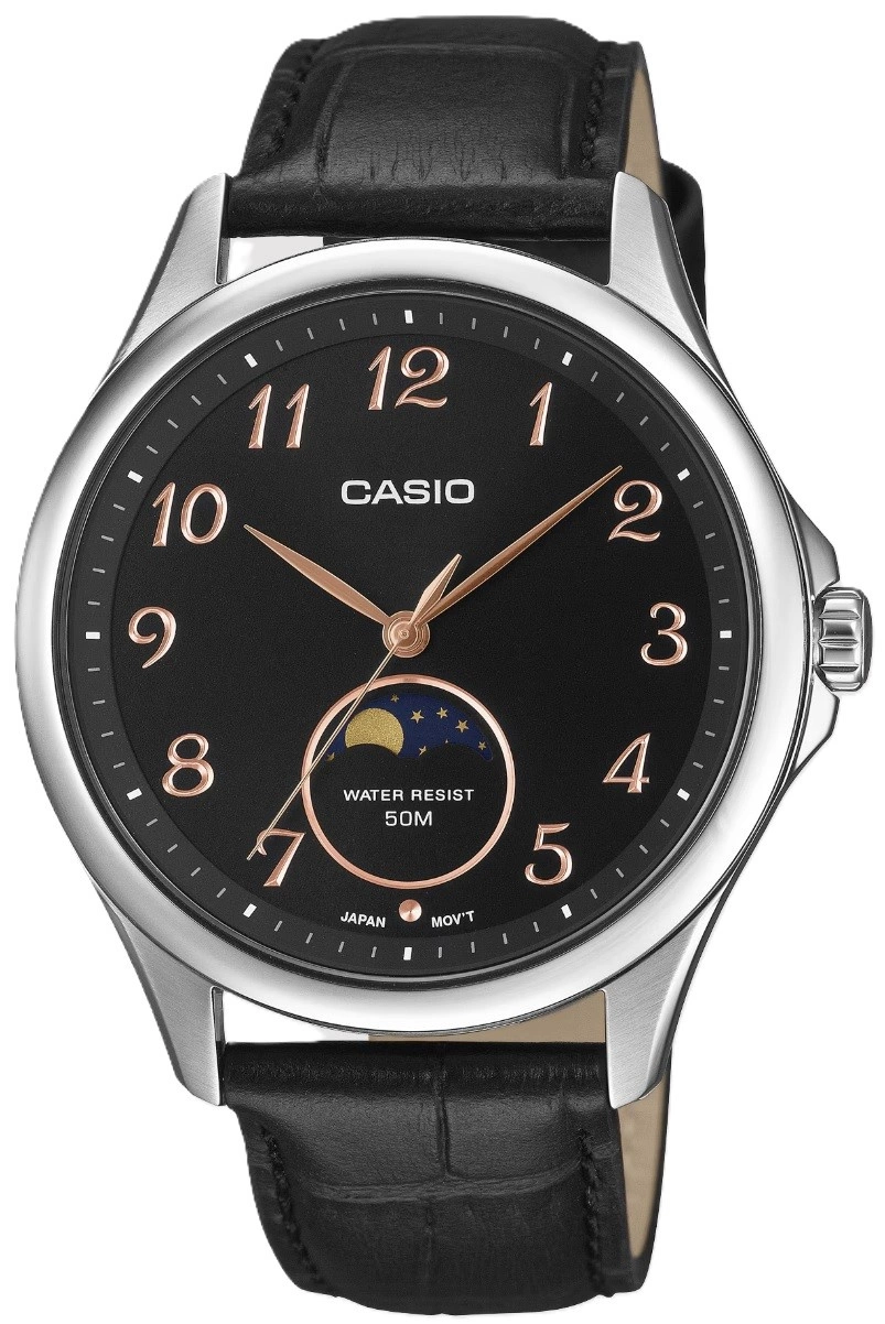 - Wodoszczelny Zegarek Męski Casio MTP-M110L-1AVER czarny na pasku, posiada wskaźnik faz księżyca