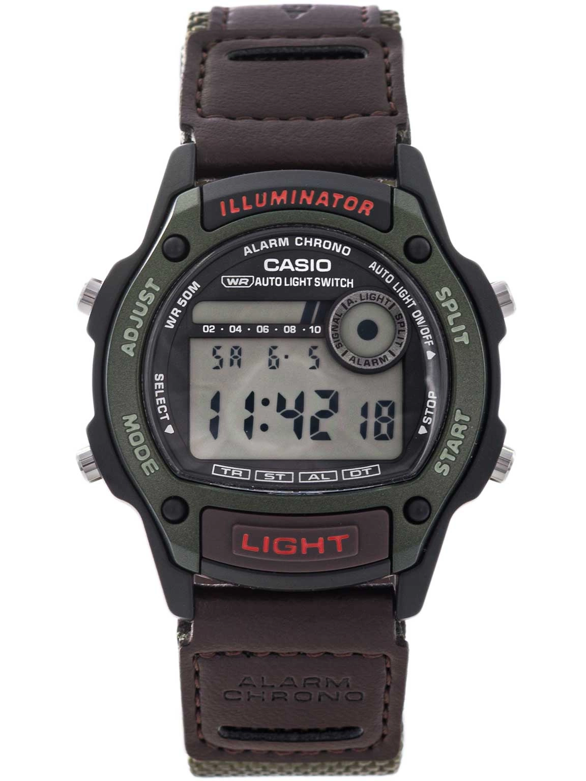 Casio W-220HF-3AVEF to cyfrowy zegarek o sportowym charakterze, wyróżniający się nietuzinkową kolorystyką, łączącą czarno-zieloną kopertę z brązowo-zielonym paskiem. Konstrukcja z lekkiego tworzywa sztucznego zapewnia komfort noszenia i odporność na codzienne użytkowanie, a wyraziste połączenie kolorów nadaje zegarkowi charakteru i energii, dzięki czemu sprawdza się zarówno podczas aktywności fizycznych, jak i w codziennych stylizacjach. Cyfrowy wyświetlacz gwarantuje czytelność godziny i innych funkcji, takich jak stoper, timer czy alarm. Funkcja podświetlenia Full-Auto LED włącza się automatycznie po uniesieniu nadgarstka lub ręcznie, umożliwiając wygodny odczyt w ciemnych warunkach. Mechanizm kwarcowy zapewnia niezawodną pracę, a wodoszczelność do 50 metrów chroni zegarek przed przypadkowymi zachlapaniami. Model wyposażono w automatyczny kalendarz, możliwość ustawienia drugiej strefy czasowej oraz dwa niezależne liczniki stopera i timer z funkcją autopowtarzania. Te funkcje sprawiają, że W-220HF-3AVEF jest praktycznym i wszechstronnym czasomierzem, który łączy sportową funkcjonalność z wyrazistym, modnym stylem.