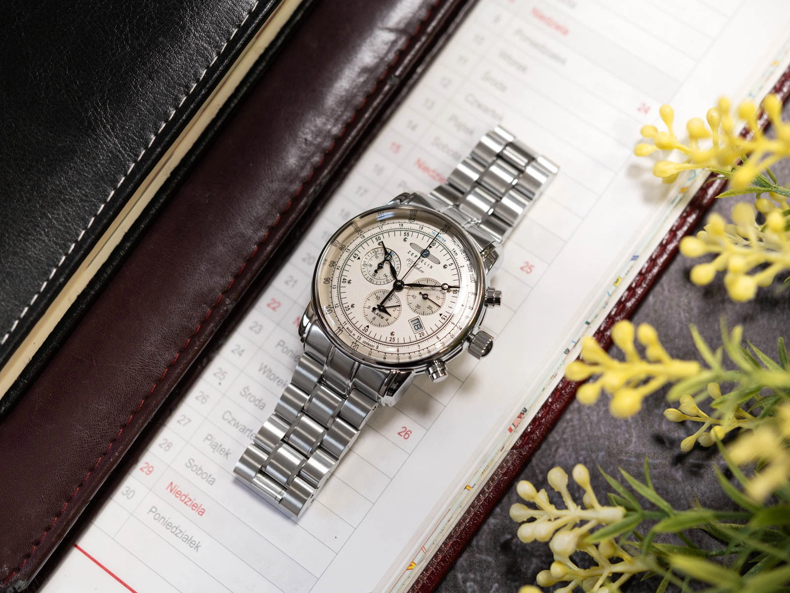 ZEPPELIN 7680MB-1 100 Jahre to czasomierz, który łączy wyrafinowaną estetykę z wysoką jakością wykonania. Dzięki starannie dobranym materiałom i dopracowanym detalom stanowi doskonały wybór dla mężczyzny ceniącego eleganckie, a przy tym trwałe i funkcjonalne dodatki. Sercem zegarka jest precyzyjny mechanizm kwarcowy Ronda 5130.D, gwarantujący niezawodność działania każdego dnia. Błyszcząca tarcza została zabezpieczona wypukłym szkłem mineralnym, które dodaje całości subtelnego charakteru retro. Na godzinie czwartej umieszczono praktyczny datownik, prezentujący aktualny dzień miesiąca, natomiast centralnie ulokowany analogowy stoper pozwala mierzyć czas nawet do 12 godzin, sterując nim za pomocą bocznych przycisków.
