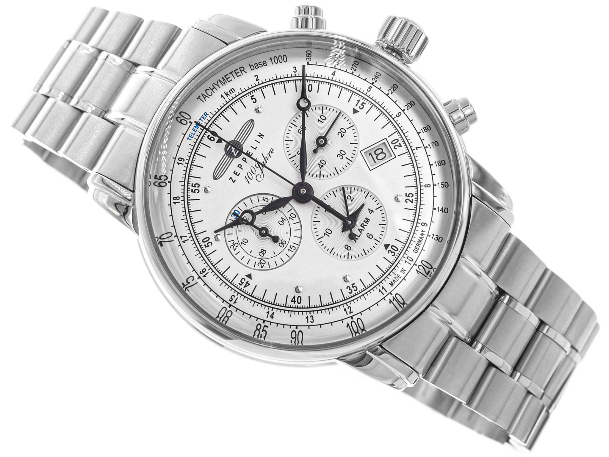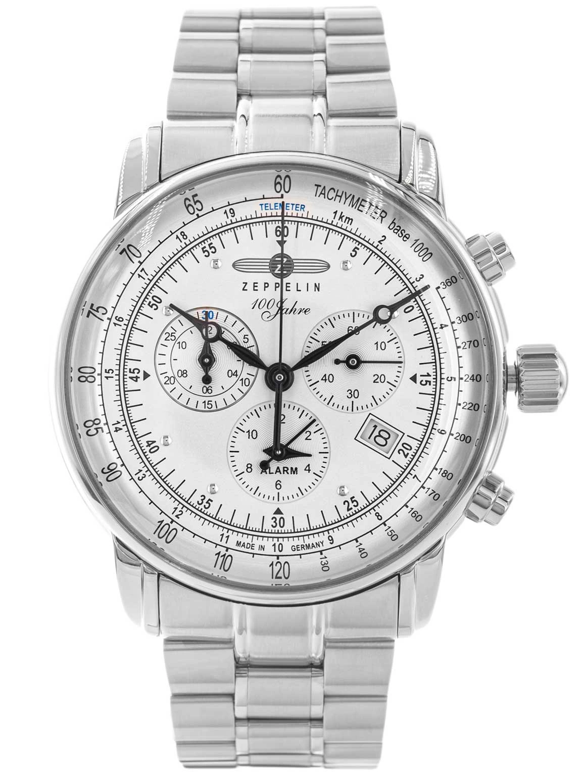- Zegarek Męski Zeppelin 7680MB-1 srebrny na bransolecie, posiada takie funkcje jak datownik, alarm i stoper.