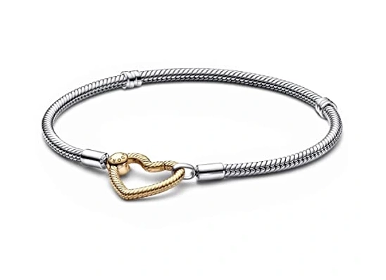 Srebrna bransoletka Pandora 569539C00 o długości 18 cm to biżuteria, która zachwyca subtelnym stylem i kunsztem wykonania. Delikatny, wężowy splot miękko układa się na nadgarstku, tworząc efekt elegancji połączonej z lekką nutą nowoczesności. Zapięcie w kształcie serca, pokryte 14-karatowym złotem, dodaje całości wyjątkowej, romantycznej oprawy i sprawia, że bransoletka staje się nie tylko ozdobą, ale również symbolem uczuć. Model ten pięknie prezentuje się noszony sam, jednak równie dobrze współgra z charmsami, zawieszkami czy klipsami, pozwalając stworzyć biżuterię o w pełni indywidualnym charakterze. Dzięki temu możesz odmieniać jej wygląd w zależności od okazji lub nastroju. Wykonana ze srebra próby 925, bransoletka wyróżnia się solidnością, odpornością na codzienne noszenie oraz trwałym, naturalnym połyskiem. To wyjątkowy dodatek, który łączy elegancję z osobistym wyrazem stylu.