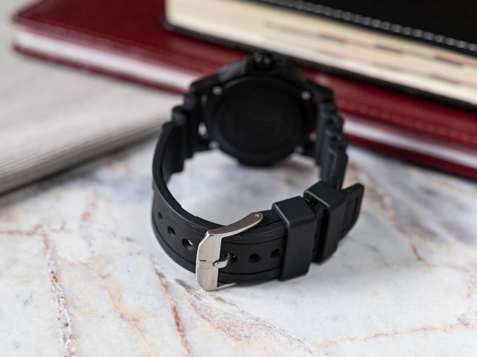 Czarna tarcza utrzymana jest w czystej, spokojnej stylistyce, a jej powierzchnię chroni szkło mineralne. Wskazówki posiadają hermetyczne kapsuły Luminox Light Technology, umożliwiające nieprzerwaną czytelność niezależnie od warunków oświetleniowych. Funkcjonalność tarczy uzupełnia okienko daty na godzinie trzeciej. Zegarek napędza szwajcarski mechanizm kwarcowy Ronda 515, ceniony za dokładność i odporność na codzienne obciążenia. Klasa wodoszczelności 100m sprawia, że model świetnie sprawdzi się zarówno w miejskim środowisku, jak i podczas rekreacji na wodzie. Całość dopełnia wygodny pasek z tworzywa sztucznego, odporny na wilgoć i stabilnie leżący na nadgarstku dzięki klasycznej sprzączce. X2.2001.BO Sea Bass 2000 to zegarek o elegancko stonowanej sylwetce, zaprojektowany z myślą o użytkownikach ceniących prostotę, trwałość i pełną gotowość na codzienne wyzwania. Łączy w sobie typową dla Luminoxa niezawodność z nowoczesnym, funkcjonalnym wzornictwem.