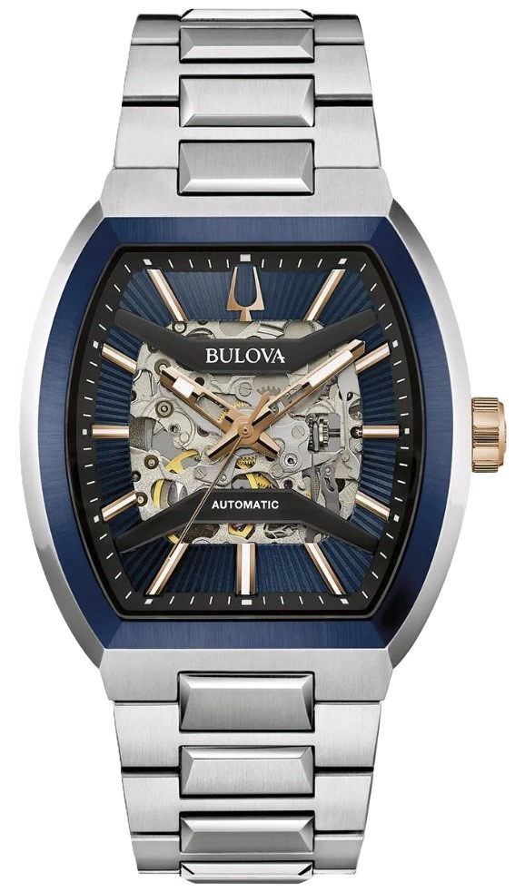 Bulova Maquina 98A319 to zegarek, w którym nowoczesna estetyka spotyka się z klasyczną sztuką zegarmistrzowską, tworząc niezwykle wyrazistą i dopracowaną kompozycję. Model ten wyróżnia się odważną formą koperty o charakterystycznym kształcie beczki, wykonanej ze stali szlachetnej w chłodnym, srebrnym odcieniu. Jej dynamiczna linia podkreśla techniczny charakter projektu, jednocześnie zachowując elegancję właściwą marce Bulova. Integralną część konstrukcji stanowi masywna, stalowa bransoleta, której spójna stylistyka harmonijnie dopełnia całość, a zapięcie motylkowe zapewnia stabilność i wysoki komfort użytkowania. Centralnym punktem zegarka jest tarcza typu skeleton w głębokim, granatowym kolorze. Przez starannie zaprojektowane wycięcie można podziwiać pracę automatycznego mechanizmu, który staje się nie tylko sercem zegarka, ale również jego główną ozdobą. Różowozłote wskazówki oraz indeksy tworzą efektowny kontrast z chłodną barwą tarczy i stalą koperty, nadając projektowi elegannej głębi. Zastosowana powłoka luminescencyjna typu neobrite zapewnia po wczesniejszym naświetleniu czytelność także po zmroku, nie zakłócając przy tym estetycznej równowagi kompozycji. Za precyzyjne odmierzanie czasu odpowiada sprawdzony, automatyczny mechanizm Citizen Miyota 8N26, oparty na 21 kamieniach łożyskujących. Konstrukcja ta oferuje stabilną pracę oraz rezerwę chodu sięgającą 42 godzin, co pozwala zachować pełną funkcjonalność nawet po dłuższej przerwie w użytkowaniu. Przeszklony dekiel dodatkowo eksponuje pracę rotora, podkreślając mechaniczny charakter zegarka i jego kolekcjonerską wartość. Całość chroni zakrzywione szkło szafirowe o wysokiej odporności na zarysowania, które subtelnie podkreśla nowoczesną bryłę koperty i zapewnia doskonałą przejrzystość tarczy. Wodoszczelność na poziomie 50 metrów pozwala na bezpieczne użytkowanie w codziennych warunkach, chroniąc mechanizm przed wilgocią i przypadkowymi zachlapaniami. Bulova Maquina 98A319 to propozycja dla miłośników zegarków o wyrazistym charakterze, którzy cenią połączenie nowoczesnego wzornictwa z tradycyjną mechaniką. Model ten przyciąga uwagę nie tylko skomplikowaną strukturą tarczy, lecz także starannością wykonania i dopracowanymi detalami, które razem tworzą zegarek o silnej, indywidualnej tożsamości. To czasomierz, który pozostaje zarówno efektownym akcentem stylizacji, jak i świadectwem fascynacji precyzyjną, mechaniczną inżynierią.
