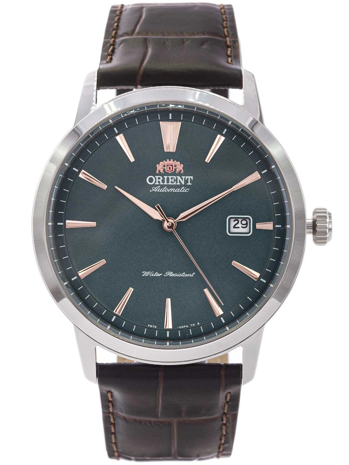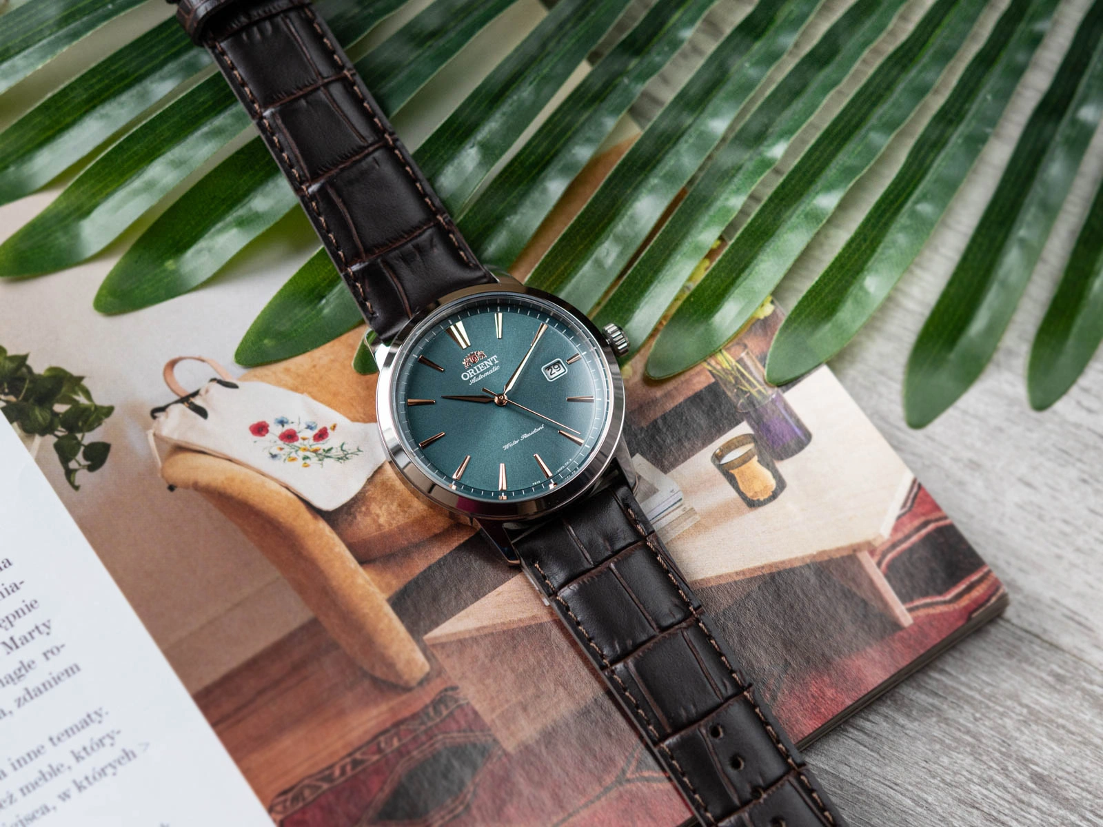 Orient RA-AC0F13E30B Contemporary Automatic to zegarek, który harmonijnie łączy klasyczną elegancję z nowoczesnym designem, tworząc czasomierz o wyjątkowym charakterze. Model ten powstał z myślą o mężczyznach, którzy cenią sobie wysmakowany styl, funkcjonalność i precyzję wykonania, a każdy detal zegarka został zaprojektowany tak, by łączyć komfort noszenia z estetycznym wyrafinowaniem. Sprawdzi się zarówno w formalnych, biznesowych stylizacjach, jak i w codziennych, mniej oficjalnych zestawieniach, pełniąc rolę eleganckiego i stylowego dodatku. Sercem tego modelu jest zielona tarcza ozdobiona subtelnym szlifem słonecznym, który w zależności od kąta padania światła mieni się refleksami, nadając powierzchni głębię i dynamiczny charakter. Różowozłote, smukłe wskazówki oraz indeksy tworzą harmonijny kontrast na tle tarczy, zapewniając doskonałą czytelność oraz elegancki, nowoczesny akcent. Na wysokości godziny trzeciej umieszczono praktyczny dodatek w postaci datownika. Na uwagę zasługuje staranne wykończenie koperty – wykonanej z wysokiej jakości stali szlachetnej w srebrnym kolorze – które nie tylko podkreśla klasyczny charakter zegarka, ale także gwarantuje trwałość i odporność na codzienne użytkowanie. Jej proporcje oraz precyzyjnie zaokrąglone krawędzie sprawiają, że model idealnie układa się na nadgarstku, zapewniając wygodę noszenia przez cały dzień.