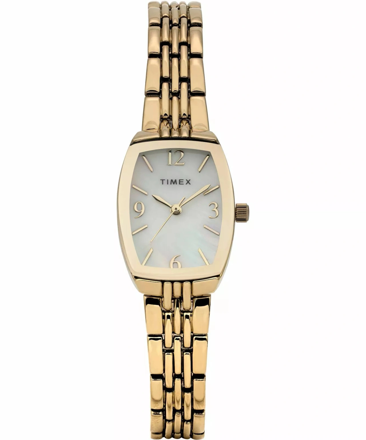 Timex TW2Y22400 Charlotte to zegarek, który przyciąga uwagę wysmakowanym fasonem i lekkością formy. Stworzony z myślą o kobietach preferujących elegancję bez przesadnych zdobień, stanowi połączenie klasycznych proporcji i nowoczesnego designu. Smukła, prostokątna koperta o delikatnie zaokrąglonych brzegach zachwyca szlachetnym, złotym wykończeniem, które pięknie komponuje się z kobiecym nadgarstkiem. Złota bransoleta stworzona z drobnych ogniw prezentuje się niezwykle efektownie, dodając całości wyrafinowanego charakteru. Perłowa tarcza subtelnie połyskuje w świetle, zmieniając swój wygląd w zależności od kąta patrzenia. Umieszczone na niej minimalistyczne indeksy oraz cienkie wskazówki tworzą harmonijną, estetyczną kompozycję, dzięki której odczyt czasu jest szybki i intuicyjny. Całość chroni odporne na zarysowania szkło mineralne, zapewniając, że zegarek zachowa swój świeży wygląd przez długi czas.