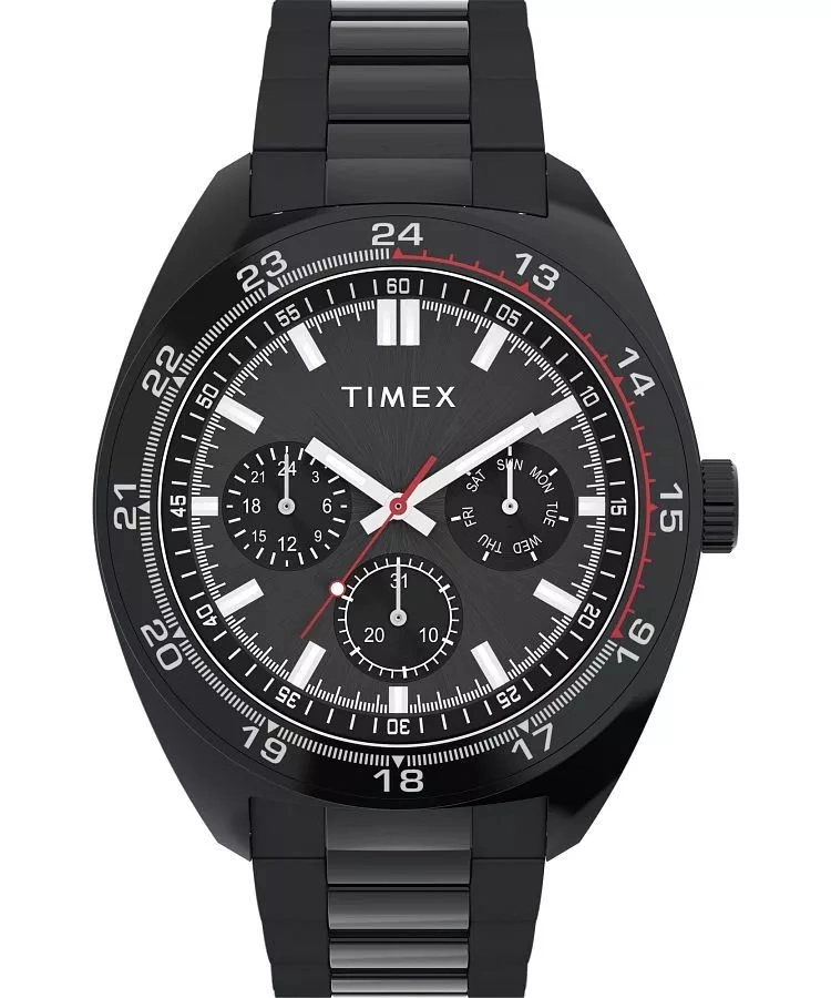 Czarna tarcza, opatrzona subtelnym logo Timex, jest przejrzysta i atrakcyjna wizualnie. Smukłe indeksy godzinowe harmonijnie współgrają z trzema subtelnie rozmieszczonymi subtarczami kalendarza  wskazującymi datę, dzień tygodnia oraz czas w trybie 24-godzinnym. Czytelność po zmroku gwarantuje powłoka Neobrite na wskazówkach, która delikatnie świeci w słabszym oświetleniu. Weston TW2Y22800 łączy funkcjonalność z nienachalną elegancją, to zegarek, który nie tylko wskazuje czas, ale również podkreśla indywidualny styl właściciela.