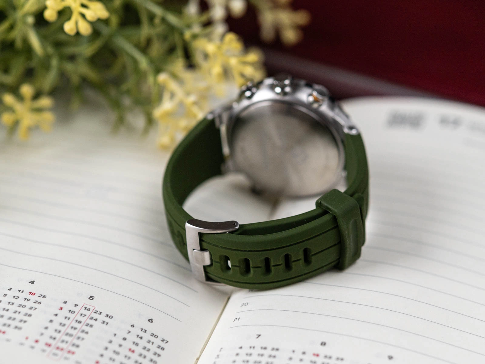Timex TW2Y14400 Expedition Tide-Temp-Compass to zegarek zaprojektowany dla tych, którzy traktują czasomierz jak prawdziwe narzędzie wyprawowe, a nie tylko dodatek do stylizacji. Wytrzymała koperta ze stali nierdzewnej w połączeniu z zielonym paskiem tworzy spójną, outdoorową estetykę, inspirowaną naturą i aktywnym trybem życia. Elastyczny pasek z silikonu, wyposażony w klasyczną sprzączkę, zapewnia stabilne dopasowanie do nadgarstka oraz wysoką odporność na wilgoć, pot i zmienne warunki atmosferyczne. Tarcza utrzymana w odcieniu zieleni nawiązuje do barw leśnych i górskich krajobrazów. Jej matowa powierzchnia skutecznie ogranicza odbicia światła, co przekłada się na doskonałą czytelność nawet przy intensywnym nasłonecznieniu. Centralne wskazówki analogowe uzupełniają trzy zaawansowane funkcje: kompas, wskaźnik pływów oraz termometr. Każdy z elementów został rozmieszczony w przemyślany sposób, dzięki czemu tarcza pozostaje przejrzysta mimo rozbudowanego zaplecza funkcjonalnego.