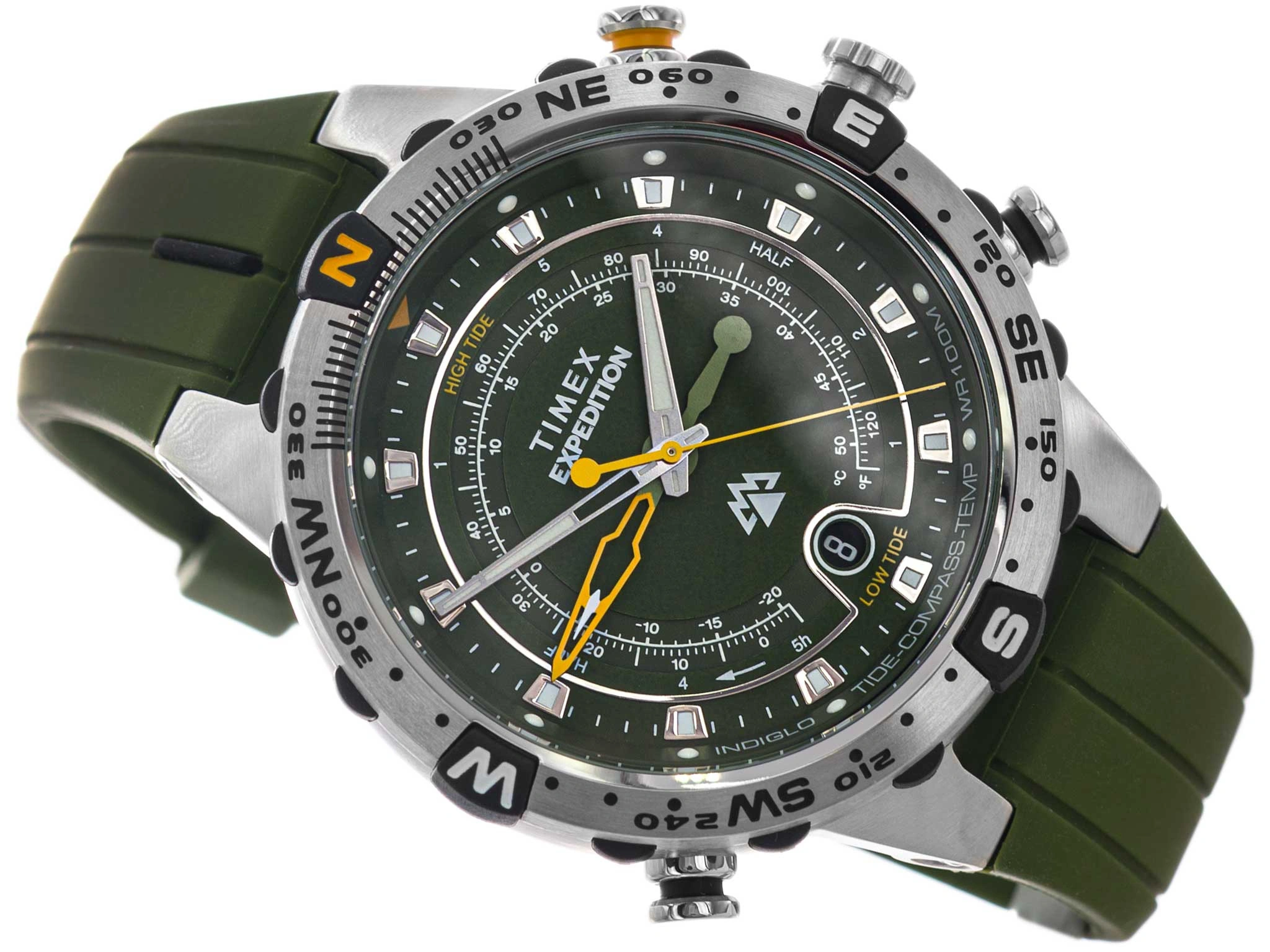 - Wodoszczelny Timex TW2Y14400 Expedition Tide-Temp-Compass zielony na pasku, posiada funkcje takie jak kompas, termometr, wskaźnik pływów, datownik, podświetlenie, neobrite.