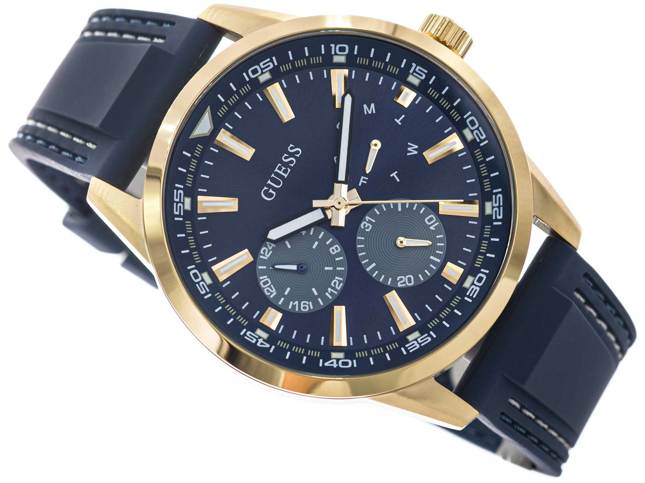 • Zegarek Męski Guess GW0964G2 niebieski na pasku, posiada funkcję datownika i neobrite.