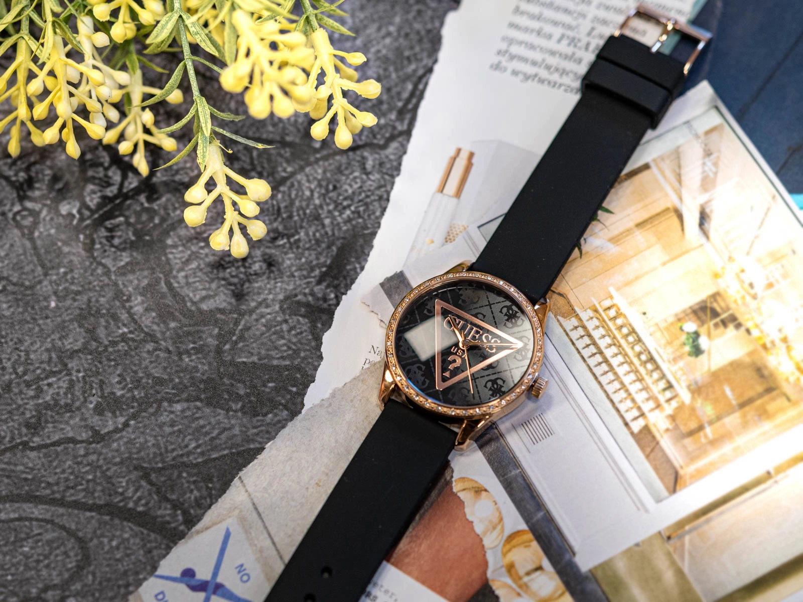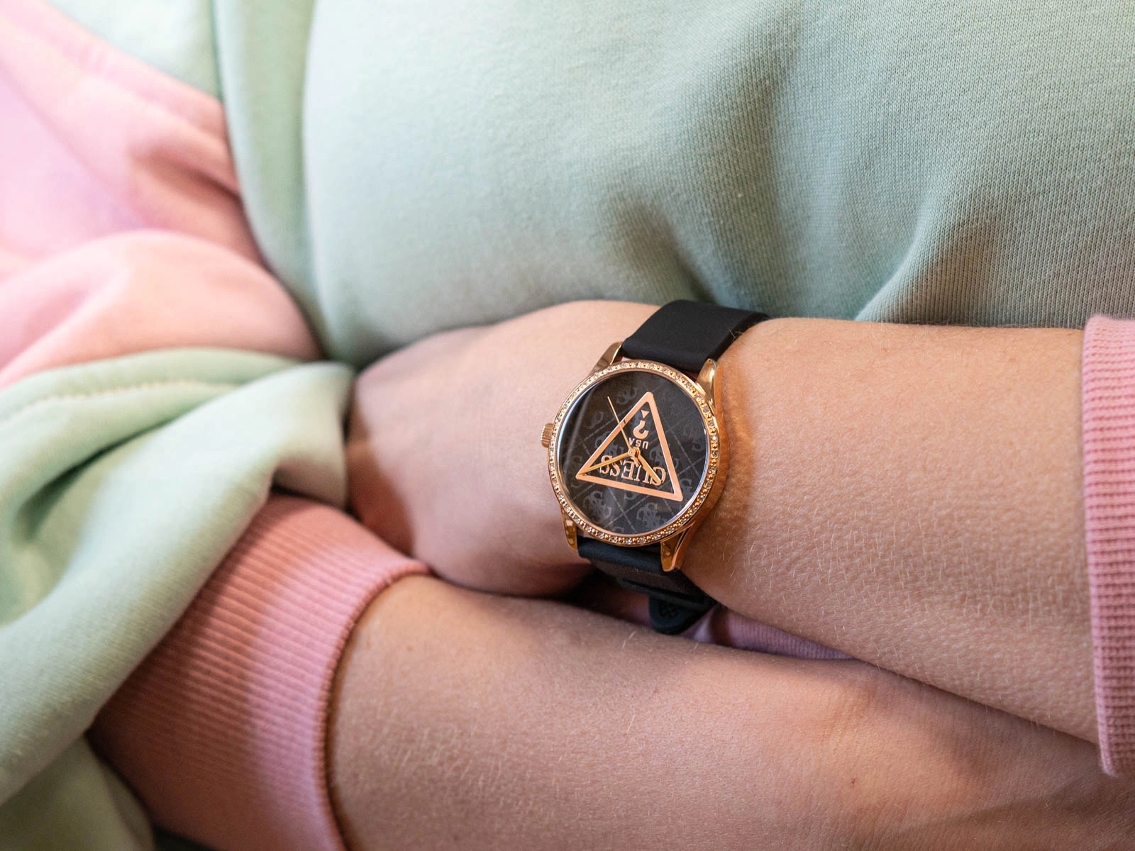 Zegarek damski GUESS GW0942L3 Roxy to wyjątkowa interpretacja nowoczesnej kobiecości, w której elegancja spotyka się z modowym charakterem marki Guess. Harmonijne zestawienie głębokiej czerni z akcentami lśniącego różowego złota tworzy efektowną, a jednocześnie wyrafinowaną kompozycję, która przyciąga spojrzenia i podkreśla indywidualny styl. Smukła koperta ze stali nierdzewnej została subtelnie rozświetlona rzędem połyskujących cyrkonii, dodających całości luksusowego wyrazu. Delikatna tarcza zachwyca minimalistycznym designem, a umieszczony w jej centrum charakterystyczny trójkątny symbol Guess stanowi modny, rozpoznawalny detal. Całość chroni trwałe szkło mineralne, odporne na codzienne drobne uszkodzenia.