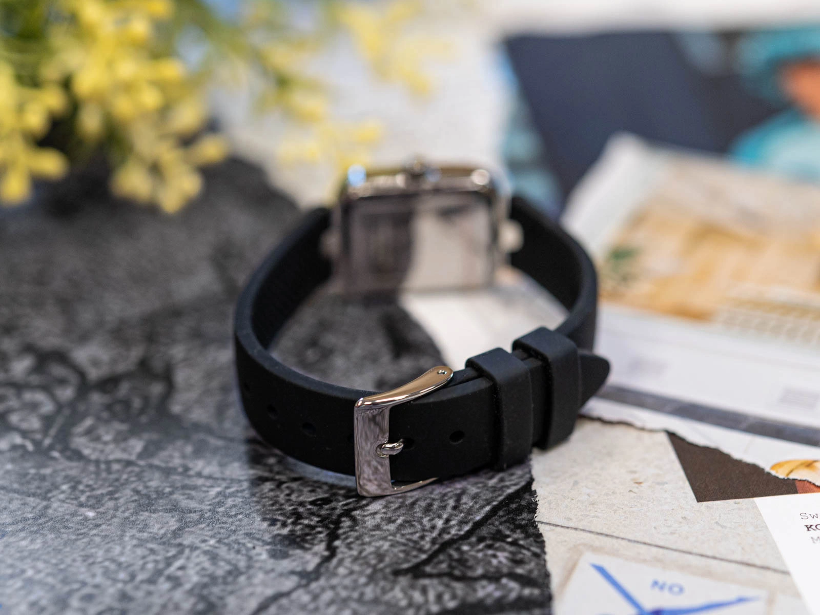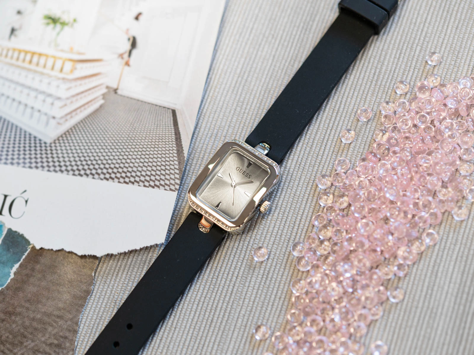 Zegarek GUESS Isla GW0926L1 to połączenie nowoczesnego wzornictwa z delikatną, kobiecą estetyką, stworzone z myślą o kobietach, które chcą łączyć modny wygląd z codzienną wygodą. Ten model doskonale odnajduje się zarówno w roli funkcjonalnego czasomierza, jak i stylowego akcentu biżuteryjnego, podkreślającego charakter stylizacji. Prostokątna koperta wykonana z trwałej stali szlachetnej wyróżnia się odpornością na czynniki zewnętrzne oraz subtelnym, srebrzystym połyskiem, który nadaje zegarkowi eleganckiej lekkości. Jej powierzchnię zdobią drobne kryształki, pięknie rozpraszające światło i nadające całości wyrafinowanego uroku. Czarny pasek z elastycznego tworzywa jest przyjemny w noszeniu, lekki i idealnie dopasowuje się do nadgarstka, zapewniając komfort przez cały dzień.