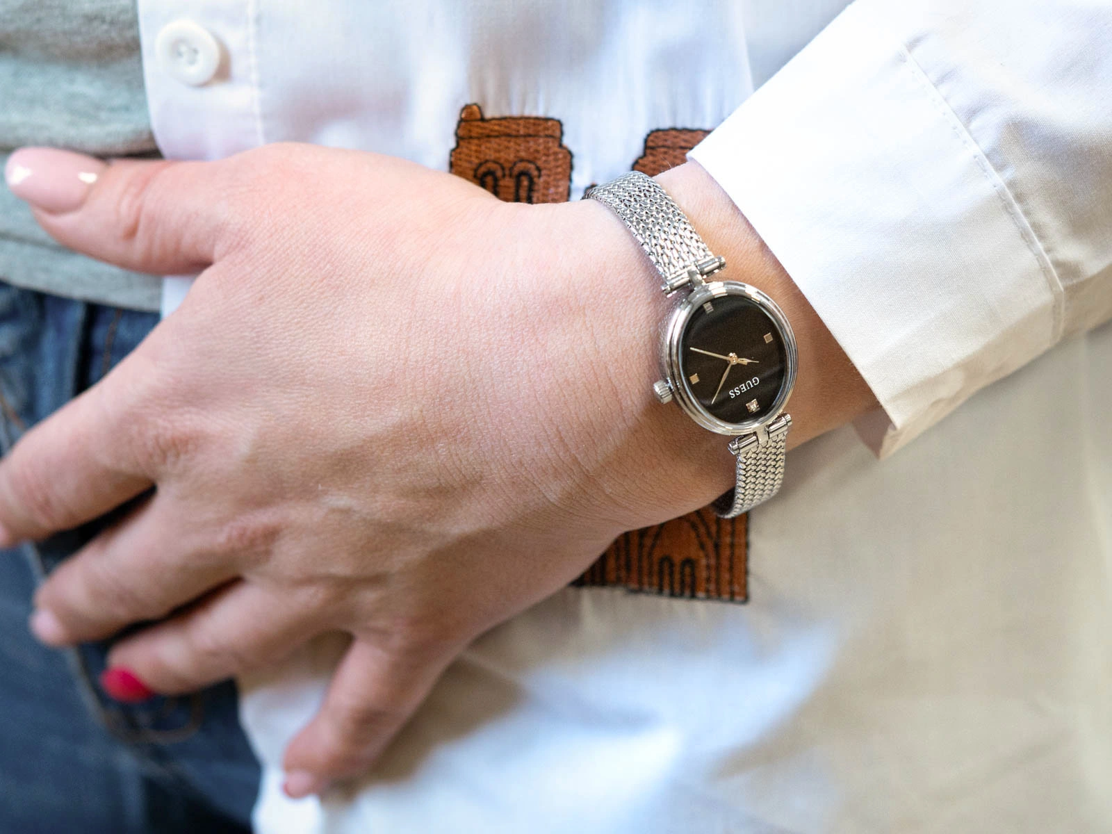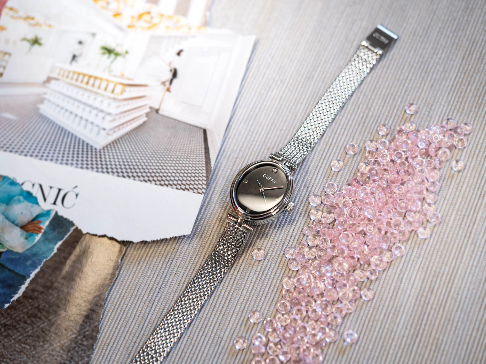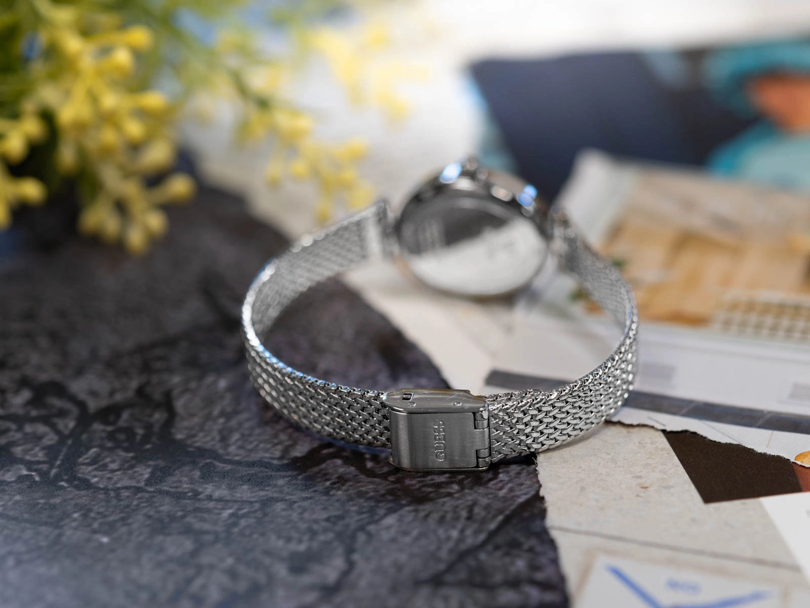 Model wyposażono w srebrną bransoletę typu mesh wykonaną ze stali nierdzewnej wysokiej jakości, która delikatnie otula nadgarstek, gwarantując komfort noszenia przez cały dzień. Pleciona konstrukcja paska nadaje lekkości i elegancji, a jednocześnie zapewnia trwałość i odporność na codzienne użytkowanie. Ruby to propozycja dla kobiet, które zwracają uwagę na dopracowane detale i eleganckie dodatki. Bez względu na to, czy połączysz go z codziennym strojem, czy z wieczorową kreacją, zegarek doda stylizacji klasy, subtelnego blasku i wyjątkowego charakteru. Produkt dostarczany jest w oryginalnym, eleganckim pudełku Guess, co czyni go doskonałym pomysłem na prezent.