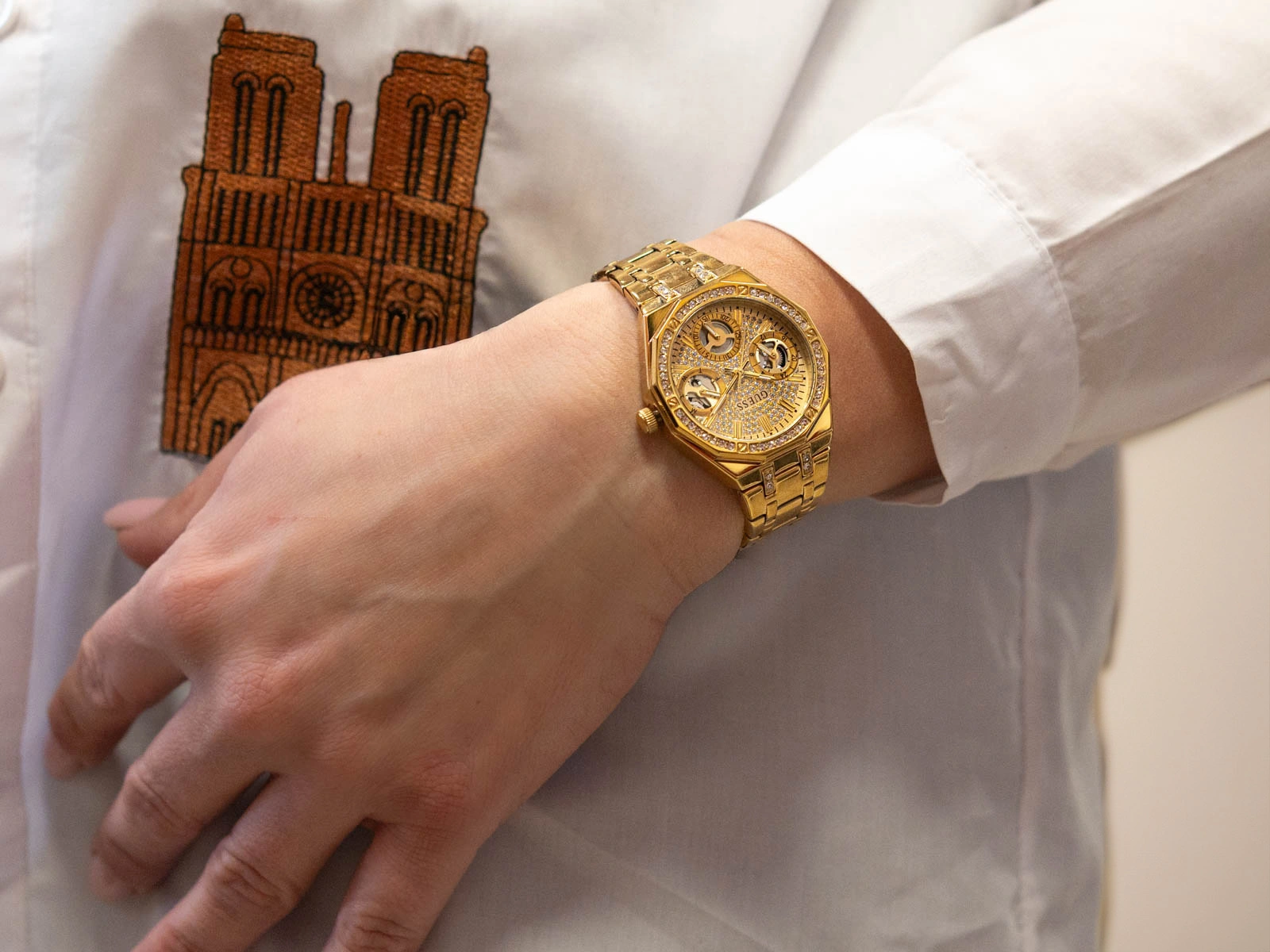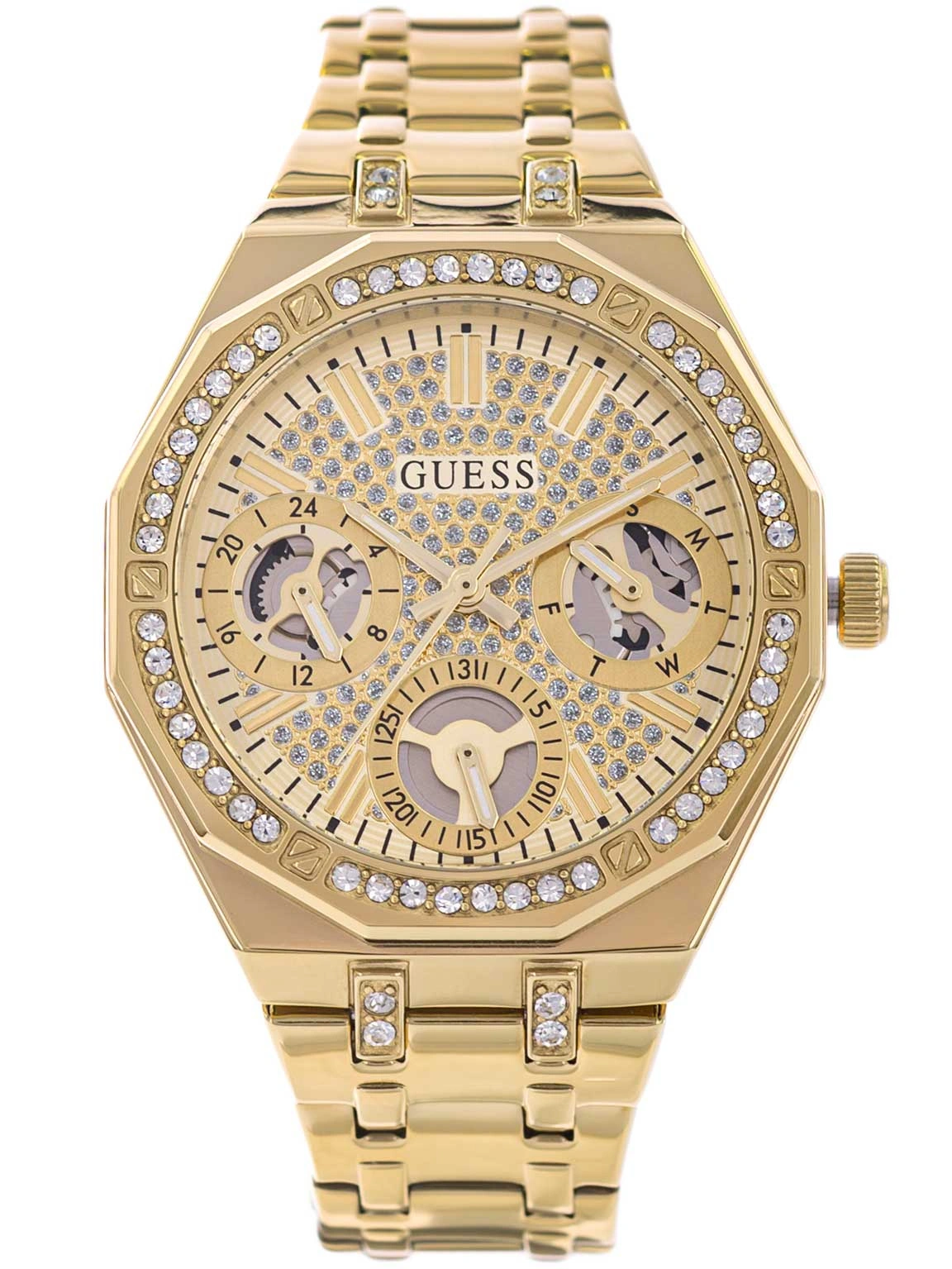 Guess GW0988L2 Quinn to wyrazista propozycja dla kobiet, które lubią łączyć elegancję z nowoczesnym charakterem. Złota kolorystyka nadaje zegarkowi luksusowy wygląd, dzięki czemu świetnie sprawdzi się zarówno w codziennych stylizacjach, jak i jako efektowne uzupełnienie stroju na wyjątkowe okazje. Koperta wykonana z trwałej stali szlachetnej została bogato ozdobiona kryształkami, które pięknie odbijają światło i przyciągają spojrzenia. Całość osadzono na masywnej, stalowej bransolecie w tym samym odcieniu złota, zakończonej praktycznym zapięciem motylkowym. Mechanizm zapięcia jest wygodny i bezpieczny – wystarczy jednocześnie nacisnąć dwa przyciski, aby szybko je odblokować.