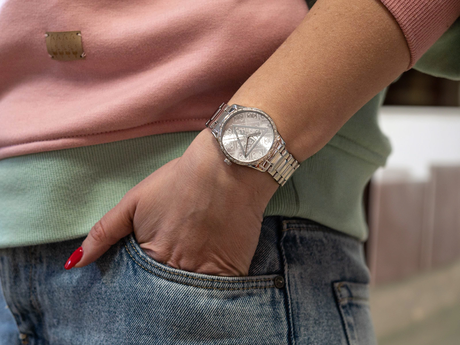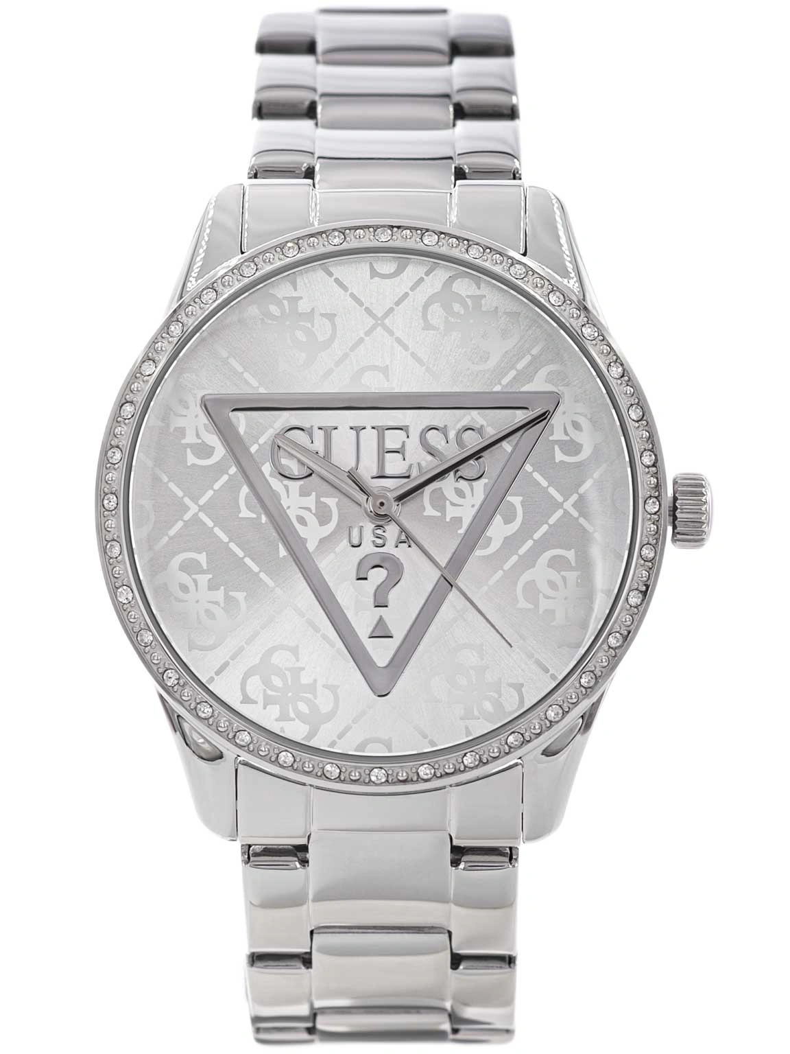 GUESS Roxy GW0987L1 to propozycja dla kobiet, które cenią wyrafinowaną elegancję połączoną z nowoczesnym detalem. Utrzymany w chłodnej, srebrnej tonacji zegarek stanowi uniwersalne uzupełnienie garderoby, doskonale komponuje się zarówno z klasycznymi zestawami, jak i bardziej wieczorowymi stylizacjami, dodając im subtelnego blasku. Koperta oraz bransoleta zostały wykonane z solidnej stali nierdzewnej, co zapewnia nie tylko trwałość, ale również niezmiennie estetyczny wygląd przez długi czas użytkowania. Tarcza przyciąga uwagę dekoracyjnym wykończeniem oraz kultowym trójkątnym logo GUESS umieszczonym w centralnej części, które podkreśla modowy charakter modelu. Dodatkowym elementem biżuteryjnym są lśniące cyrkonie osadzone wokół koperty, nadające całości eleganckiego, kobiecego wyrazu.