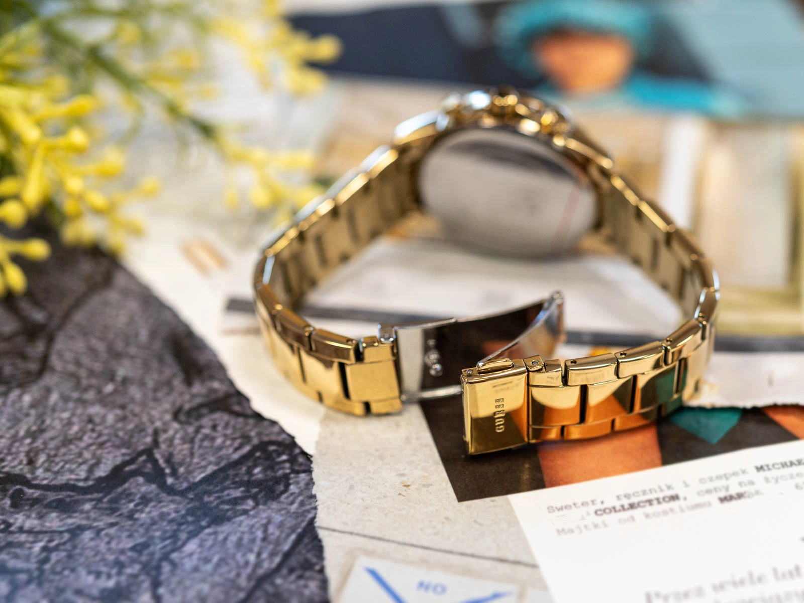 Złota koperta wykonana ze stali nierdzewnej idealnie współgra z dopasowaną bransoletą, tworząc spójną i elegancką całość. Solidna bransoleta została wyposażona w wygodne i bezpieczne zapięcie, które zapewnia komfort noszenia oraz stabilność na nadgarstku. Dzięki wodoszczelności na poziomie 3 ATM zegarek jest odporny na codzienne zachlapania, co czyni go praktycznym dodatkiem na każdy dzień. Guess GW0933L6 Bailey to propozycja dla kobiet, które poszukują modnego zegarka łączącego estetykę biżuteryjną z funkcjonalnością. Stylowe, firmowe opakowanie sprawia, że model ten doskonale sprawdzi się również jako elegancki prezent dla bliskiej osoby.