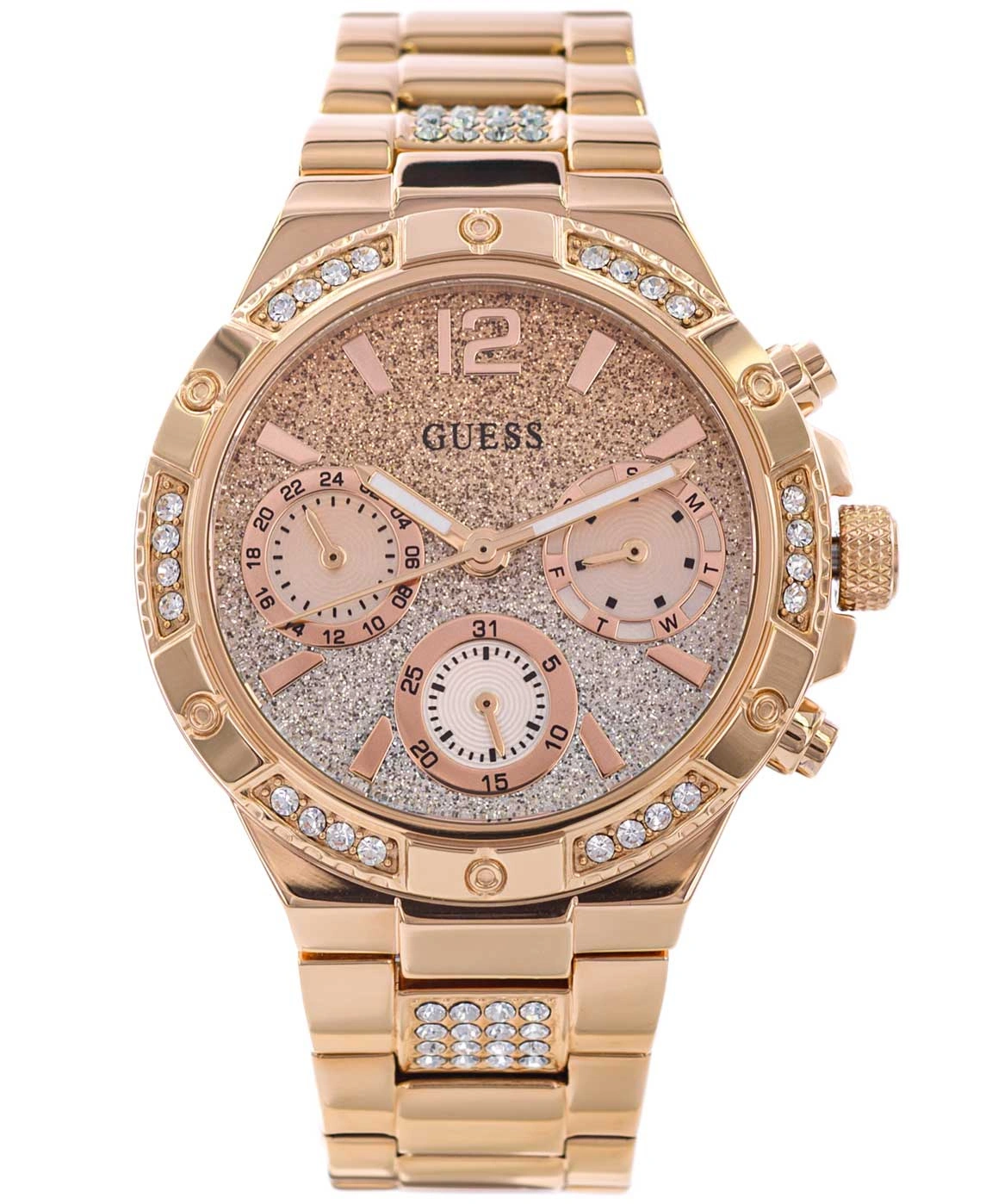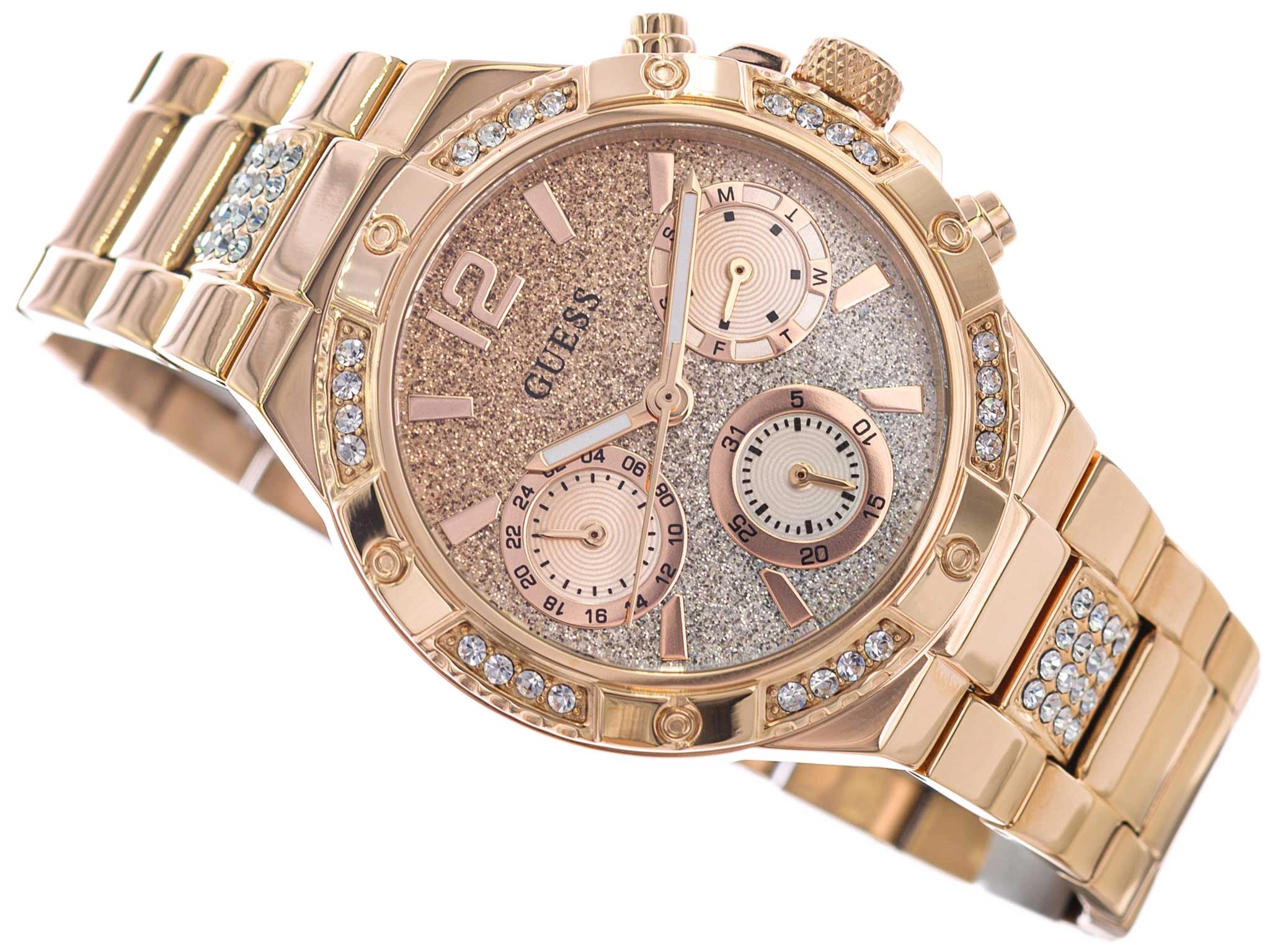 • Zegarek Damski Guess GW0950L4 różowe-złoto na bransolecie, posiada funkcję datownika.