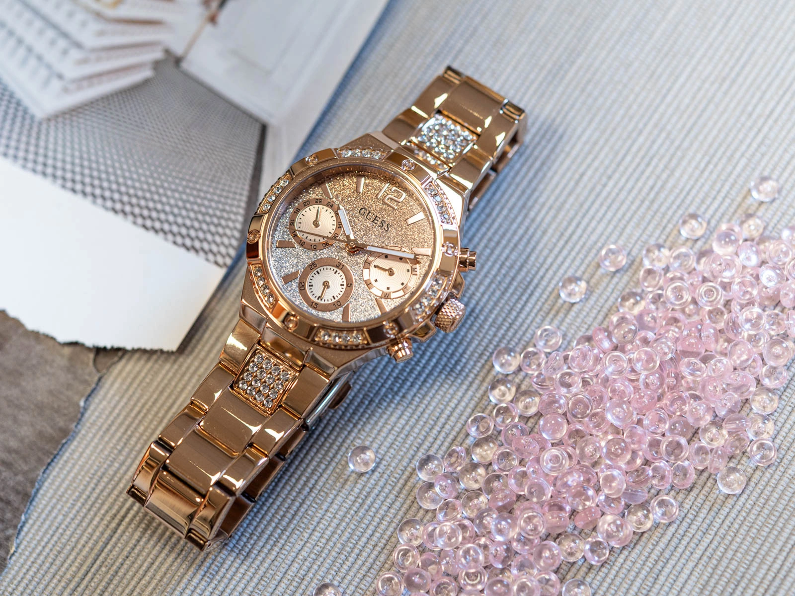 Damski zegarek Guess GW0950L4 Harlow to połączenie elegancji i nowoczesnego stylu, które zachwyca starannym wykończeniem i wyjątkowym designem. Jego subtelny blask różowego złota, podkreślony delikatnym efektem ombre na tarczy oraz cyrkoniami zdobiącymi kopertę, sprawia, że zegarek staje się wyrafinowanym dodatkiem do każdej stylizacji, dodając jej szyku i kobiecego charakteru. Cyferblat wyposażony jest w praktyczny datownik z subtarczą wskazującą dzień miesiąca, dzień tygodnia oraz czas w formacie 24‑godzinnym, co umożliwia szybki i wygodny dostęp do kluczowych informacji o czasie. Całość chroniona jest mineralnym szkłem odpornym na zarysowania, zapewniając przejrzystość i trwałość cyferblatu nawet przy codziennym użytkowaniu.