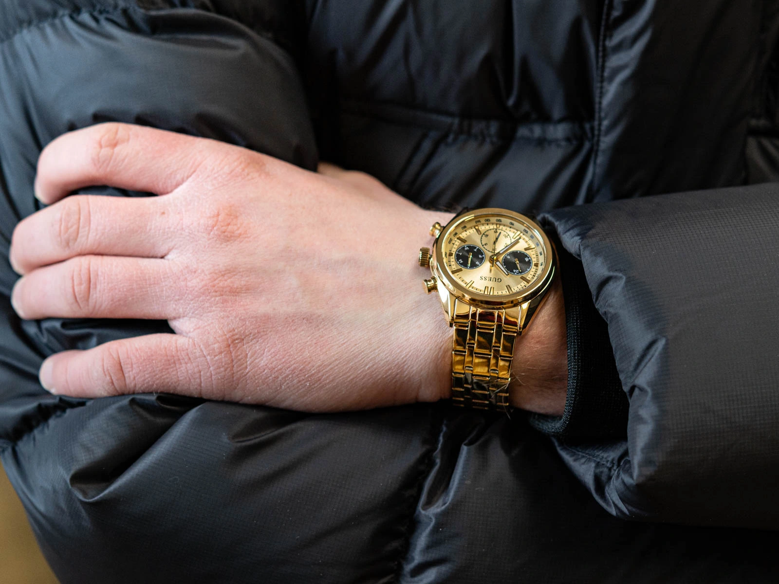 Złota bransoleta harmonijnie współgra z kopertą, tworząc spójną i elegancką całość. Solidne zapięcie zatrzaskowe z dodatkowym zabezpieczeniem zapewnia komfort i pewność noszenia, eliminując ryzyko przypadkowego odpięcia. Cyferblat w klasycznym, złotym odcieniu stanowi stylowe tło dla wyrazistych, luminescencyjnych wskazówek, które ułatwiają odczyt godziny nawet w słabszym oświetleniu. Subtelny szlif słoneczny na tarczy dodaje całości elegancji, tworząc efektowne odbicia światła, które podkreślają luksusowy charakter zegarka.