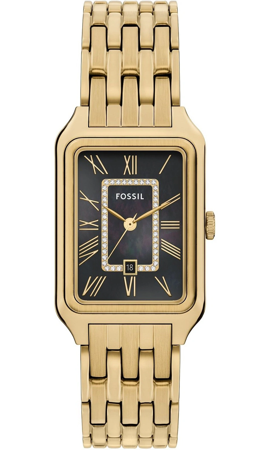Fossil ES5417 Raquel to damski zegarek analogowy, który łączy geometryczną formę z wyrafinowaną estetyką inspirowaną klasyką. Prostokątna koperta wykonana z trwałej stali nierdzewnej w złotym odcieniu prezentuje harmonijne proporcje i subtelny połysk, podkreślający biżuteryjny charakter modelu. Jej starannie wykończona powierzchnia płynnie współgra z metalową bransoletą utrzymaną w tej samej tonacji kolorystycznej, tworząc spójną i elegancką całość.
