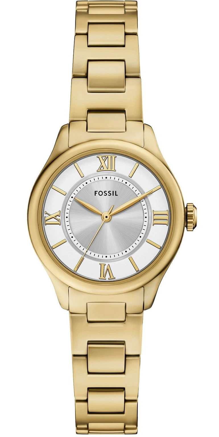 Fossil ES5421 to damski zegarek analogowy, który łączy klasyczną estetykę z subtelną nowoczesnością. Smukła koperta wykonana ze stali nierdzewnej w złotym odcieniu zachwyca wyważonymi proporcjami i starannym wykończeniem, podkreślając elegancki, biżuteryjny charakter modelu. Jej delikatny połysk harmonijnie współgra z metalową bransoletą utrzymaną w tej samej tonacji, tworząc spójną i estetycznie dopracowaną całość.
