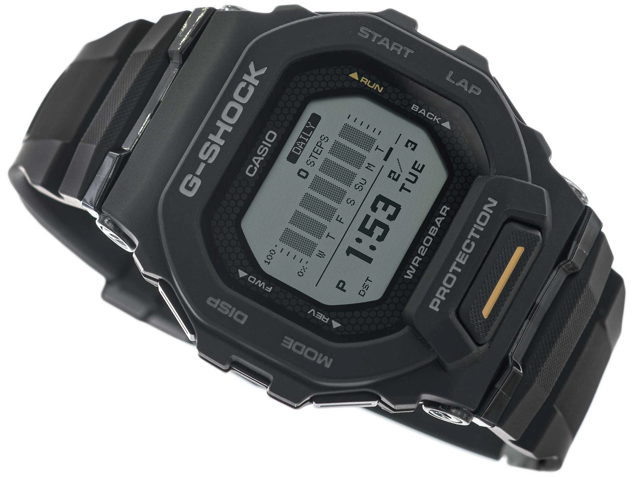 Casio GBD-200-1A1ER to nowoczesny zegarek sportowy należący do kolekcji G-SHOCK G-SQUAD, stworzony z myślą o osobach aktywnych, które oczekują połączenia niezawodnej wytrzymałości z zaawansowanymi funkcjami treningowymi. Model ten wyróżnia się odświeżoną konstrukcją koperty, wykonaną z lekkiego i niezwykle odpornego tworzywa żywicznego, zaprojektowaną w taki sposób, aby ograniczyć masywność typową dla klasycznych G-SHOCKÓW, przy jednoczesnym zachowaniu pełnej wstrząsoodporności. Zintegrowanie elementów koperty z ramką nadaje całości bardziej zwarte proporcje, a ostre, techniczne linie widoczne po bokach podkreślają sportowy i nowoczesny charakter zegarka.