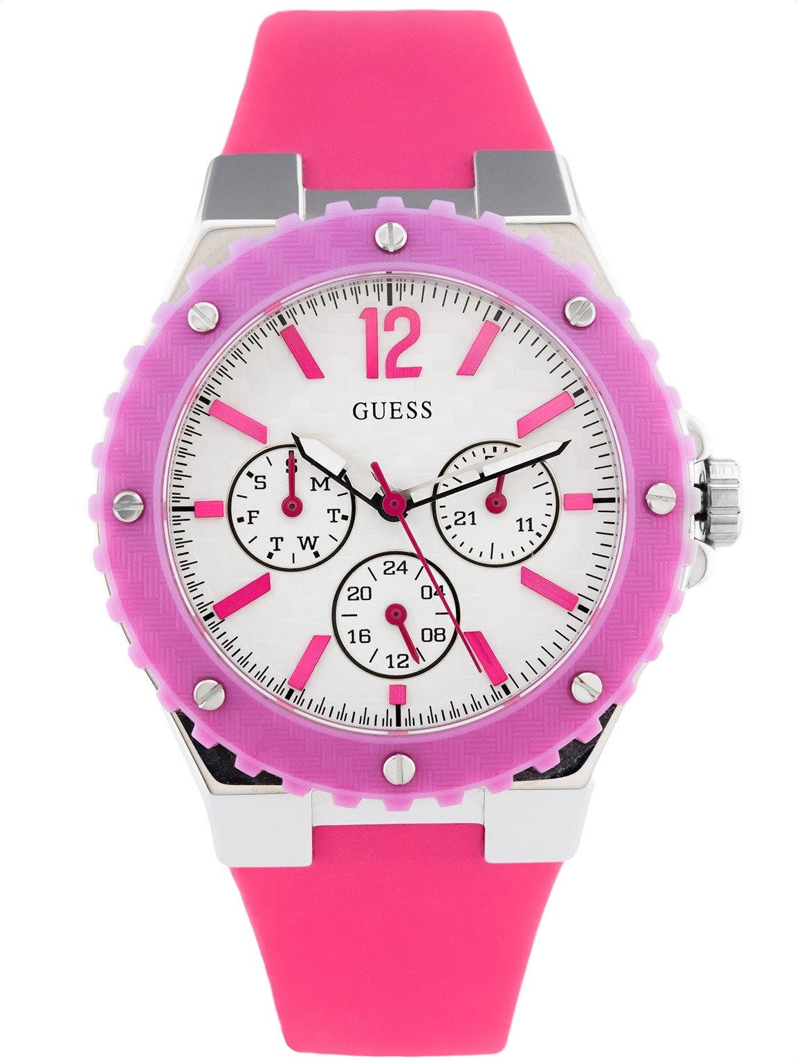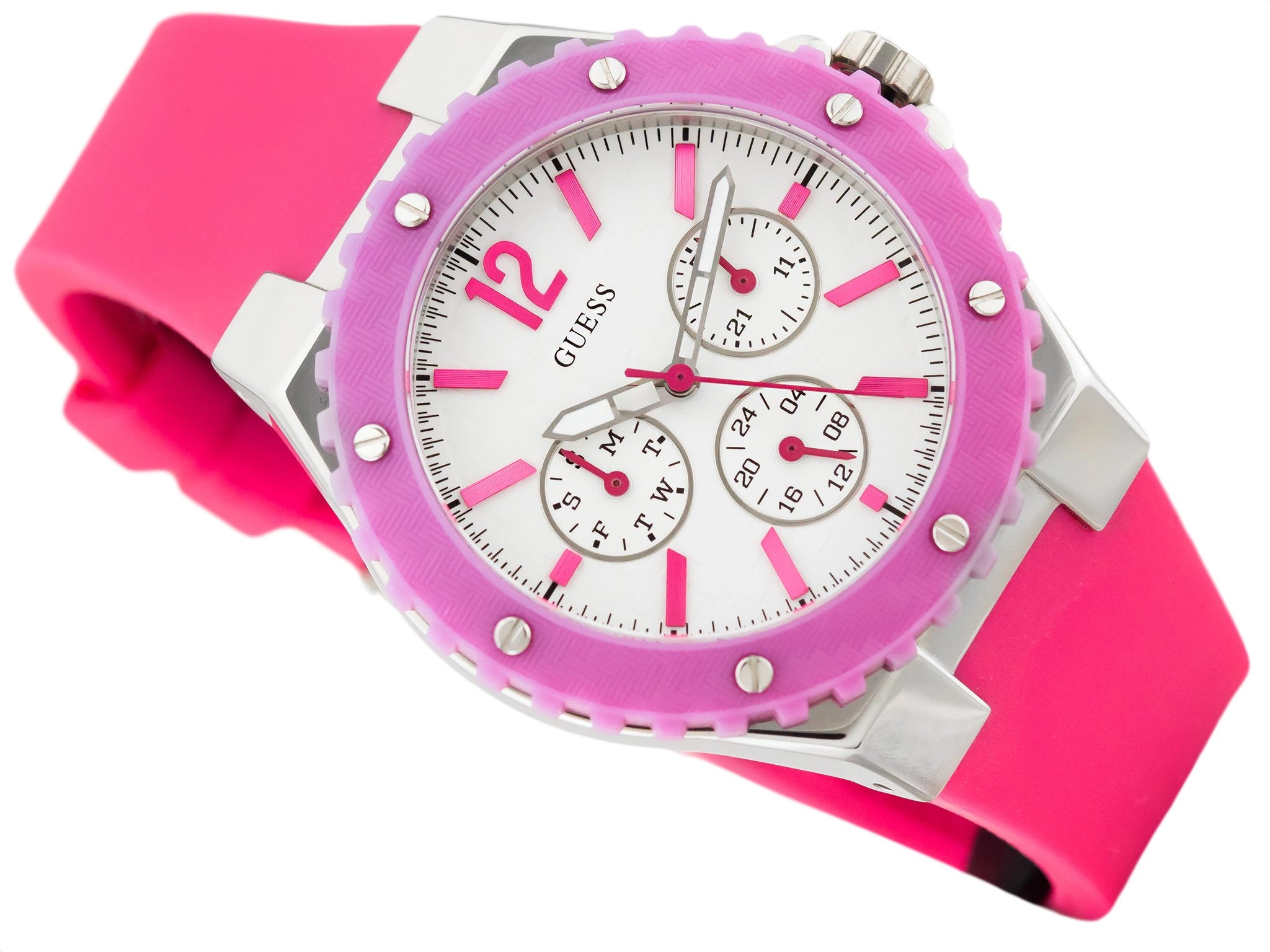 • Zegarek Damski Guess W90084L2 różowy na pasku, posiada funkcję datownika.