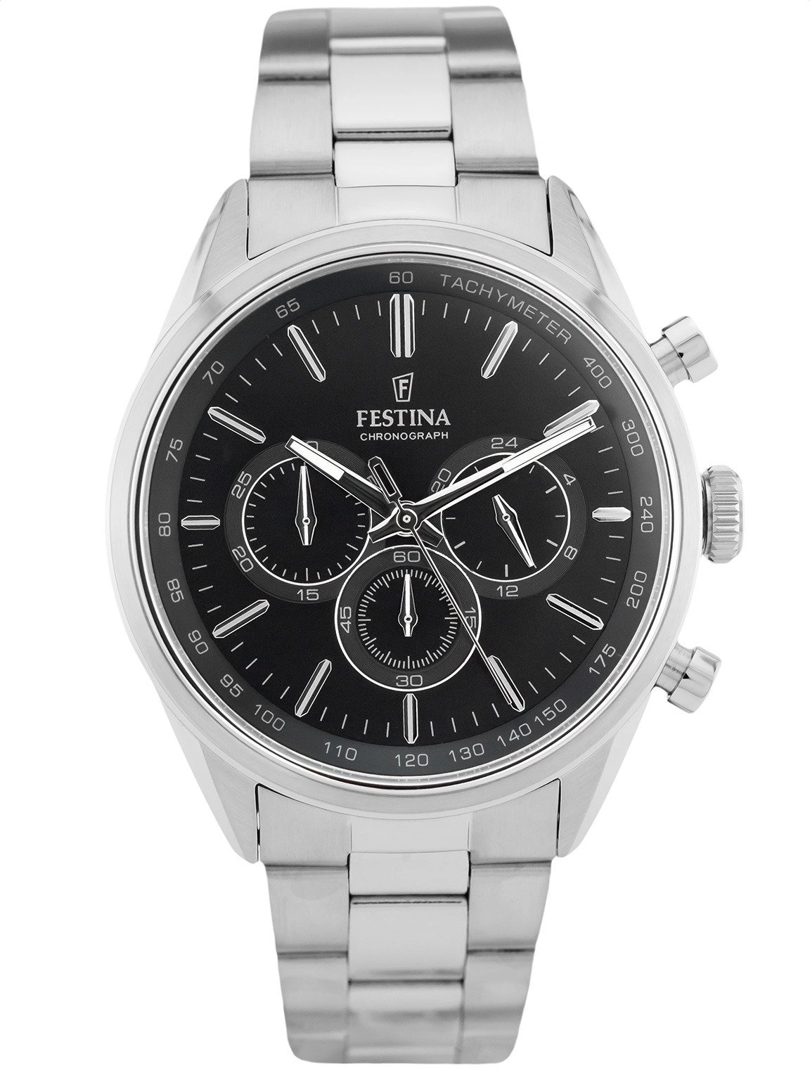 - Wodoszczelny Zegarek Męski Festina F16820/4 srebrny na bransolecie, posiada funkcje takie jak stoper i datownik.