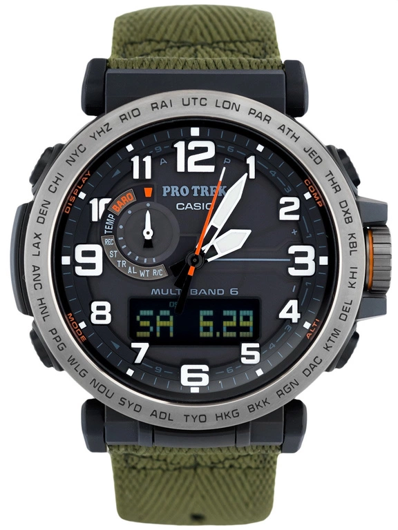 - Solarny Zegarek Męski Casio PRW-6600YB 3 zielony na pasku, posiada funkcje takie jak sterowanie radiowe, stoper i datownik. Zegarek wodoszczelny.