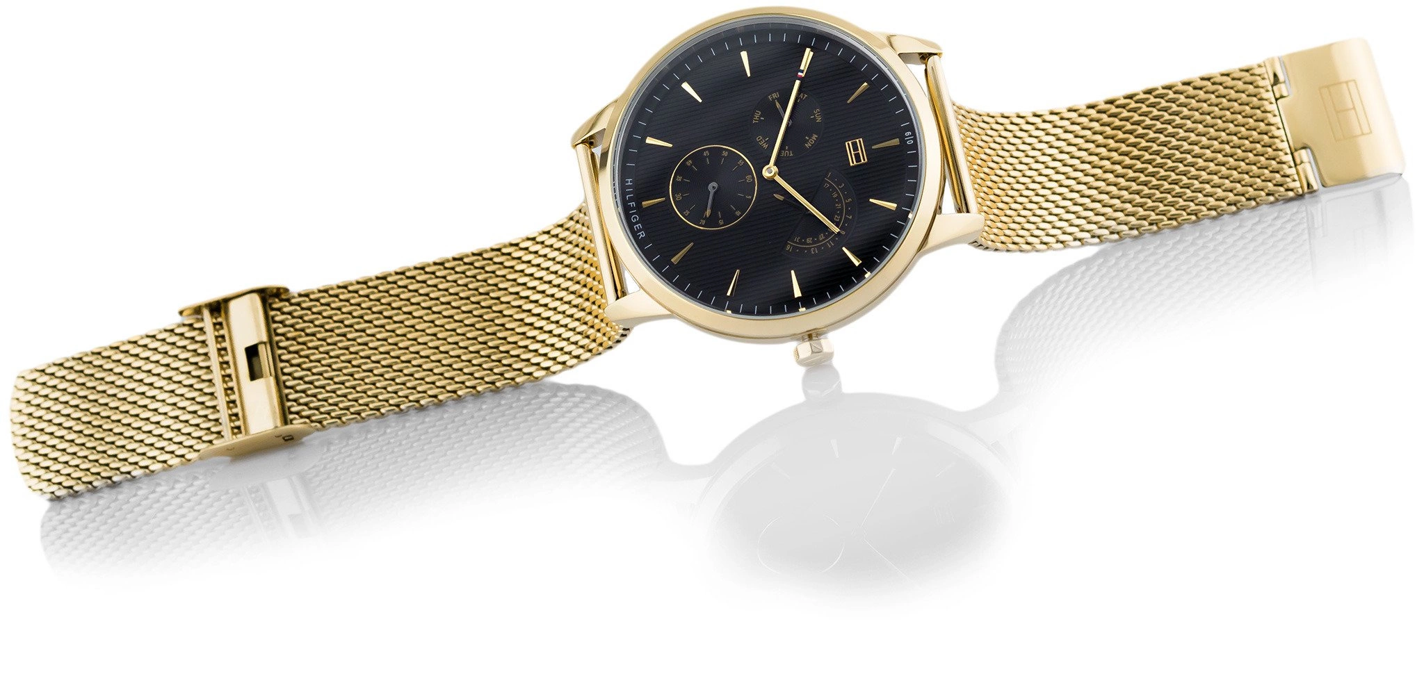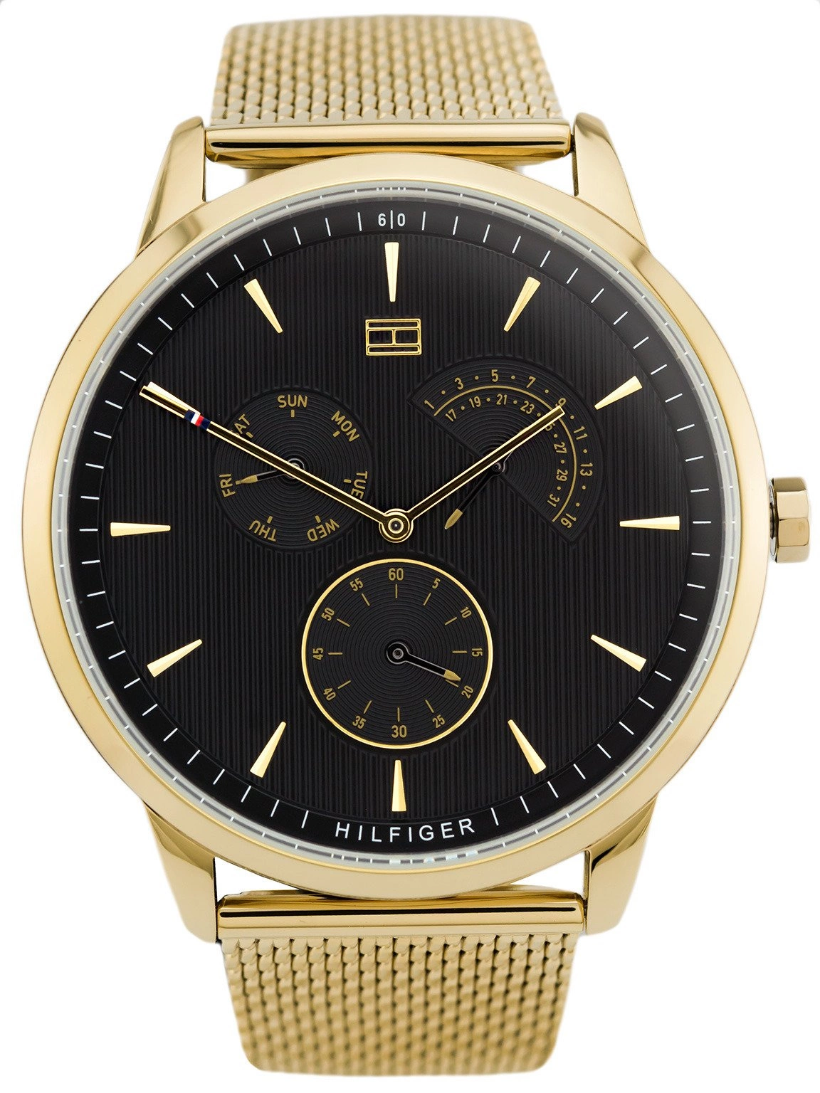 - Zegarek Męski Tommy Hilfiger 1710386 złoty na bransolecie, posiada funkcję datownika.