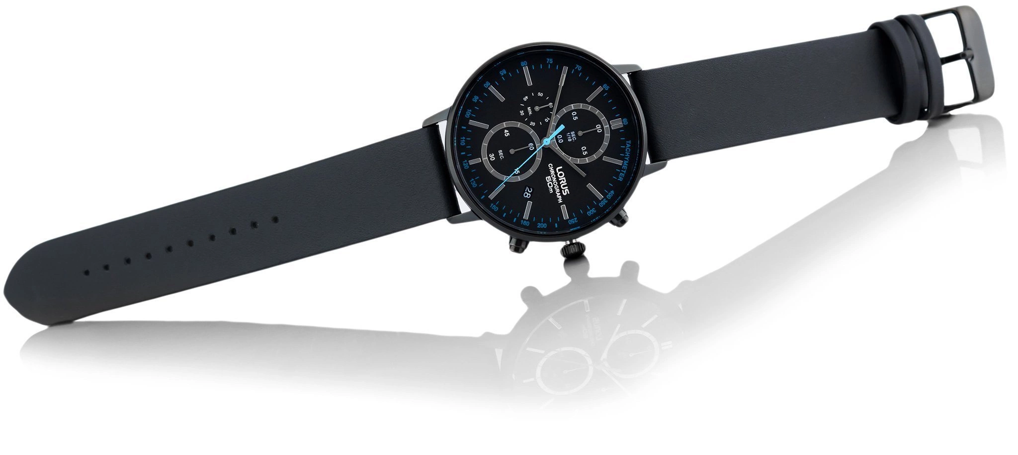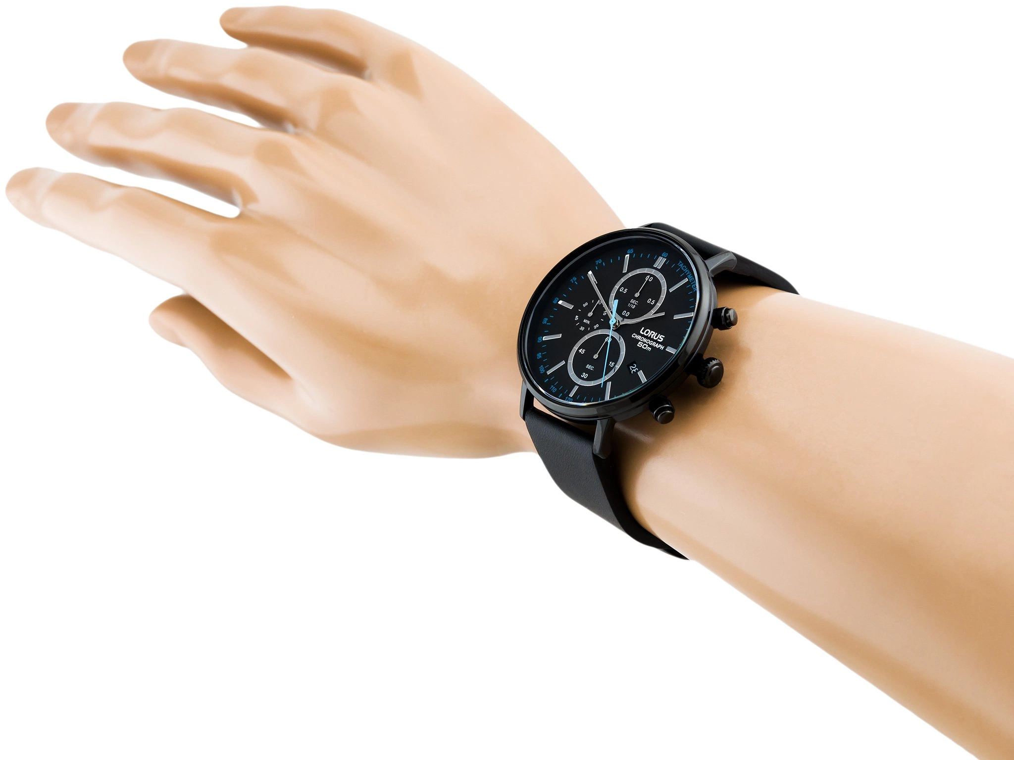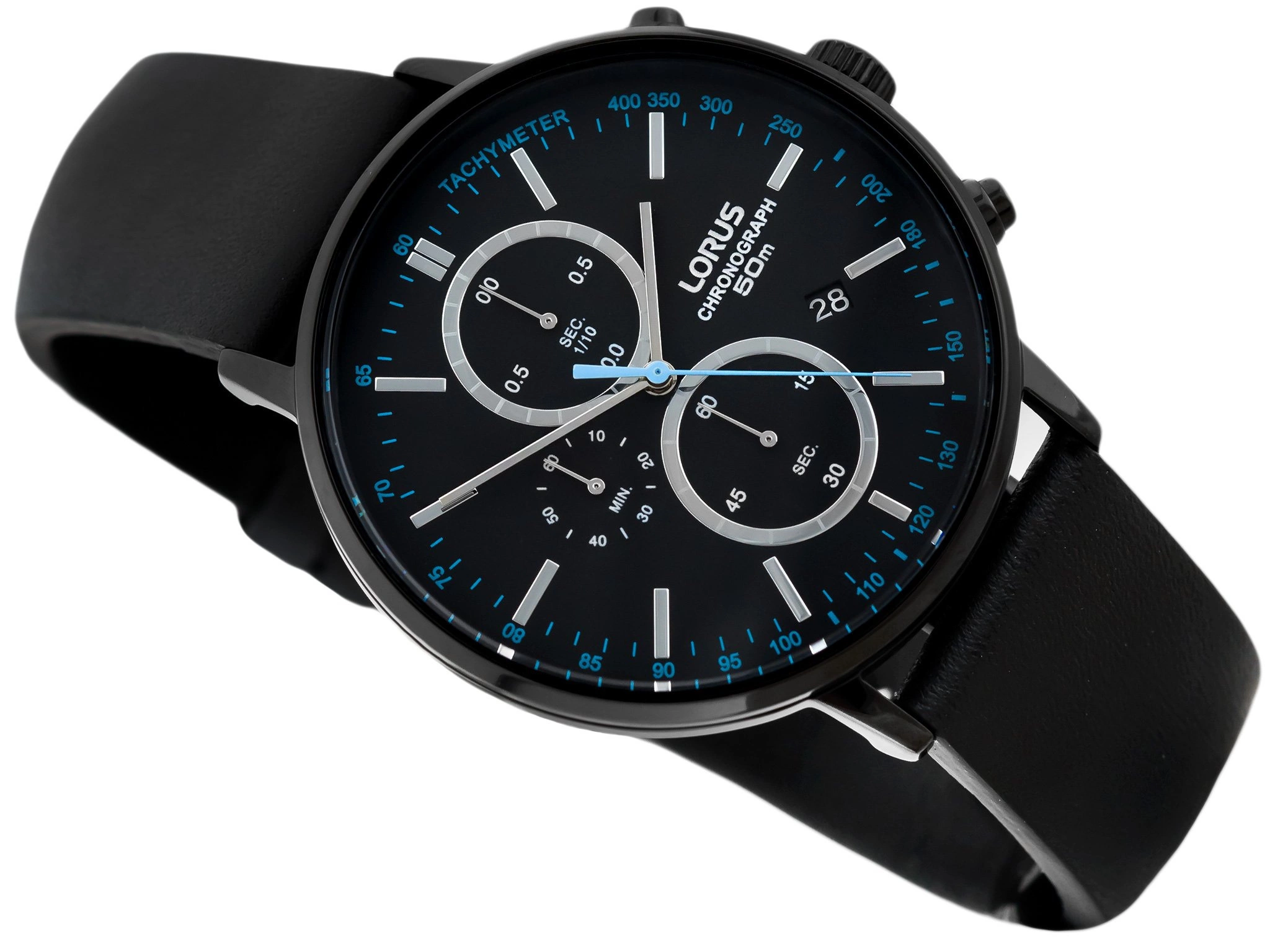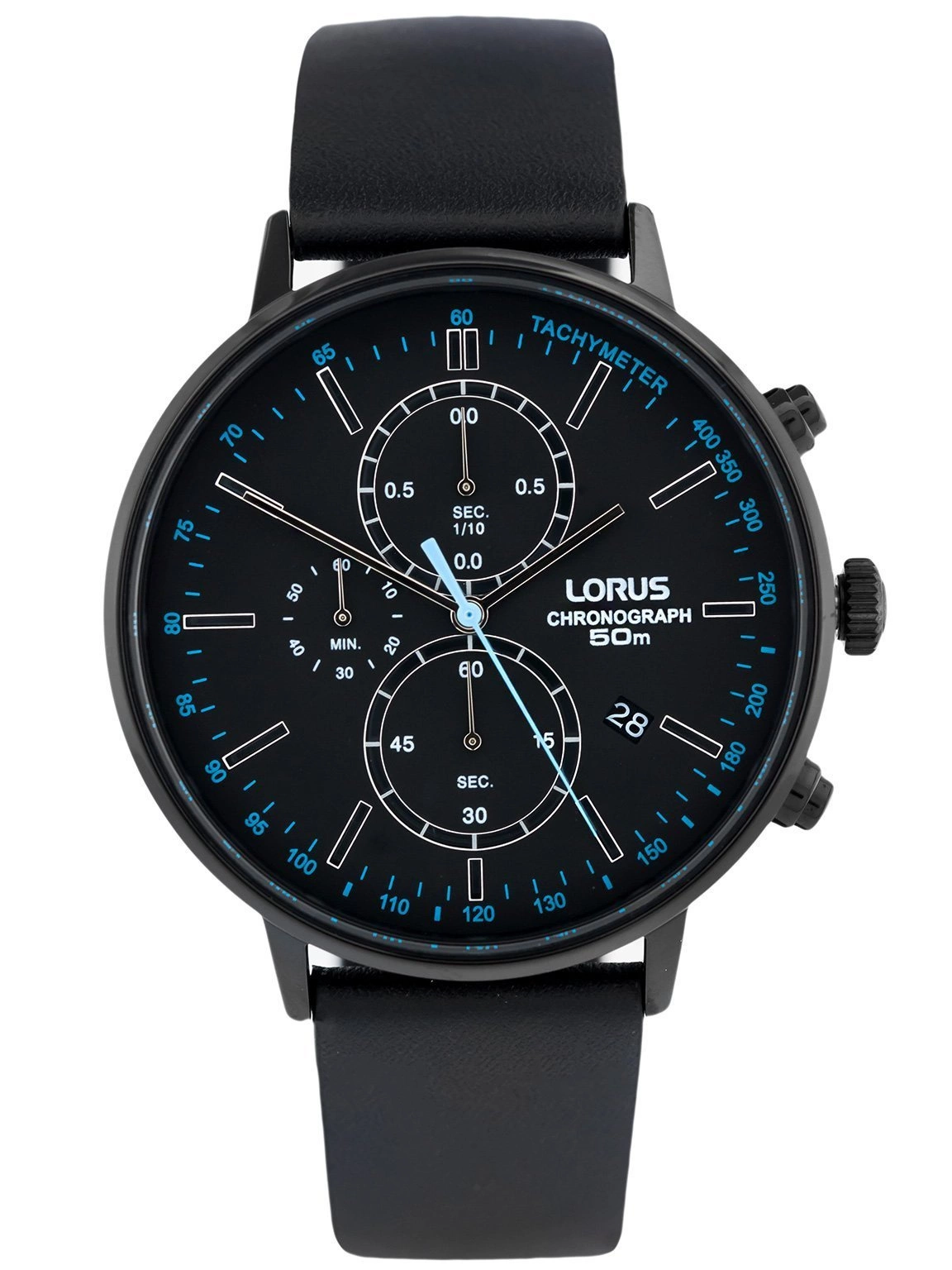 • Zegarek Męski Lorus RM363FX9 czarny na pasku, posiada funkcje takie jak stoper i datownik.